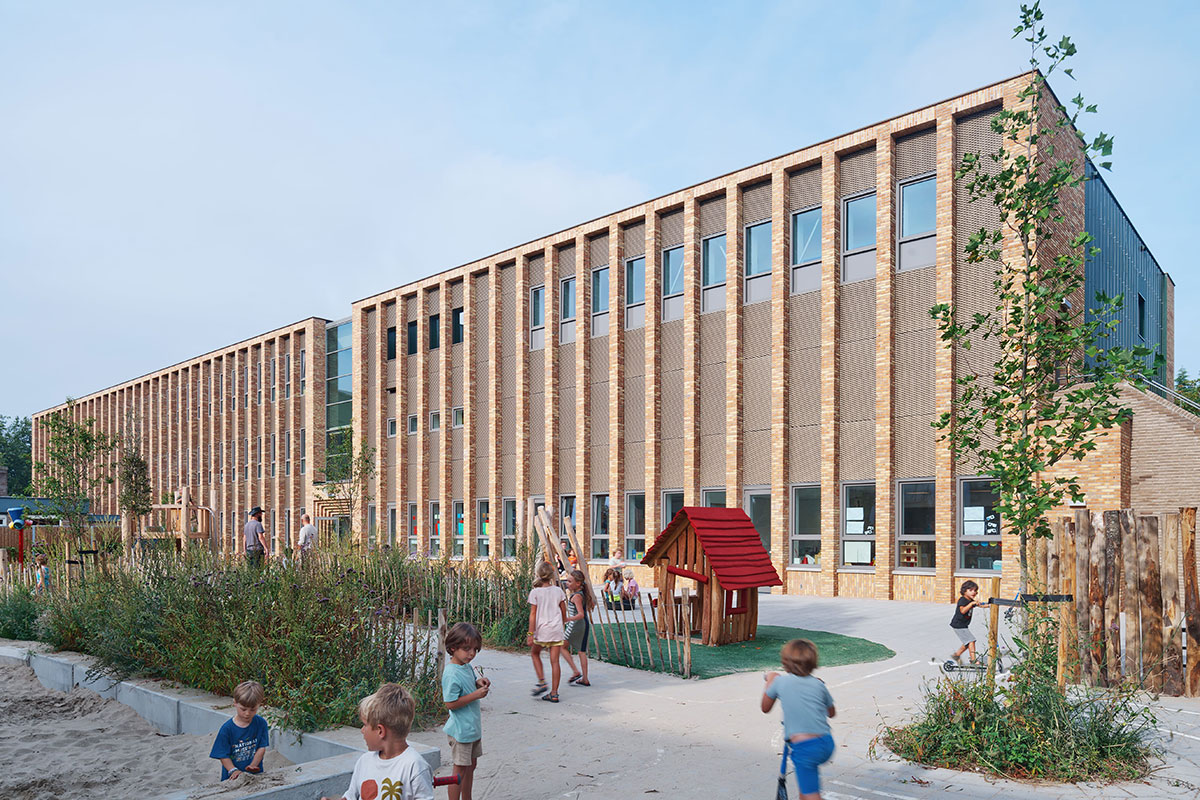 Duurzaamheid stond vanaf het begin centraal. We gebruikten baksteen uit restpartijen, hout als basis in het interieur en veel biobased materialen. Het gebouw is helemaal gasloos en slim georiënteerd: open en licht aan de noordkant, meer gesloten en zelfschaduwend aan de zuid- en westkant. Op het dak liggen zonnepanelen die niet alleen de school maar ook de buurt van energie voorzien. De begroeide gevel, de moestuinen op het dakterras en de natuurrijke speelplaats versterken de biodiversiteit en maken de school een groene long voor de wijk.