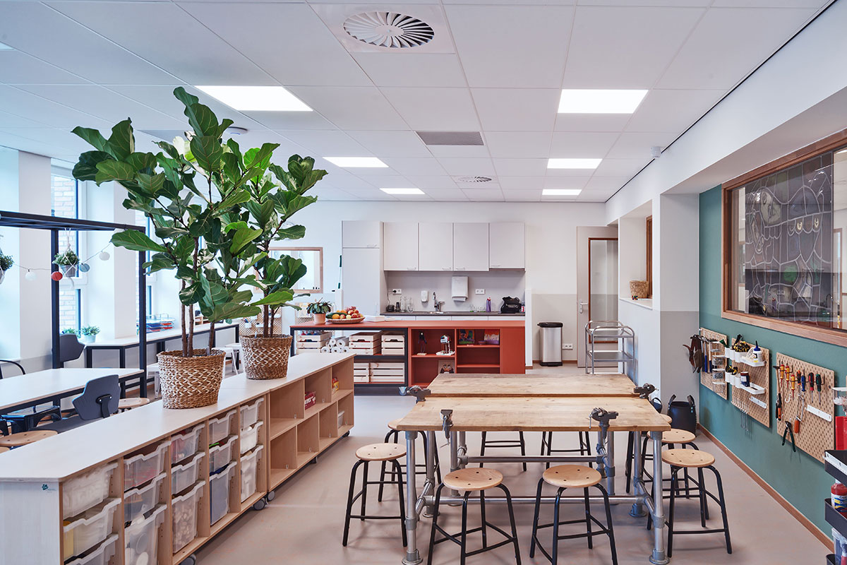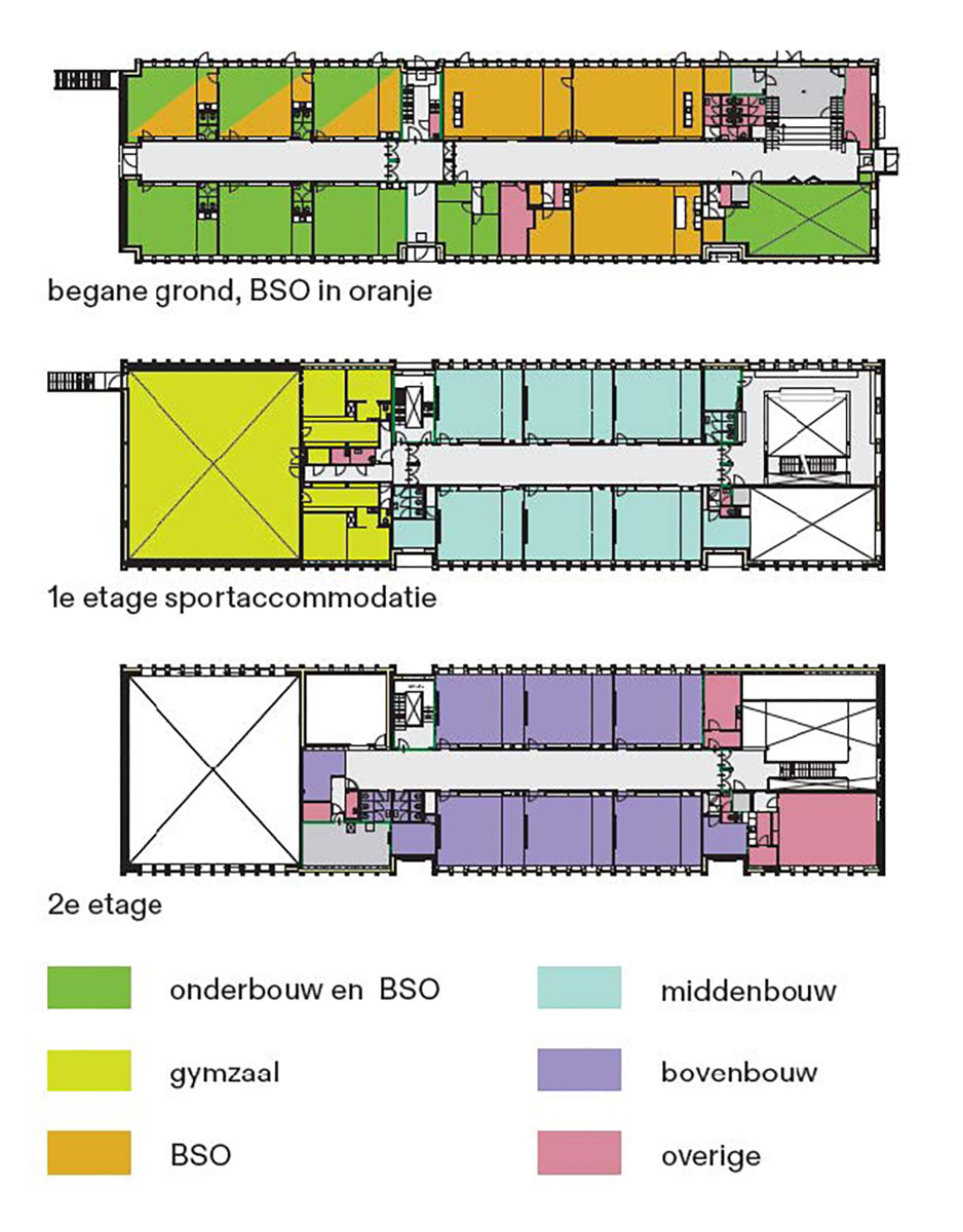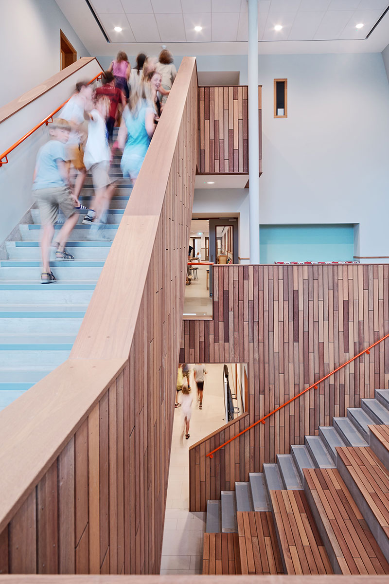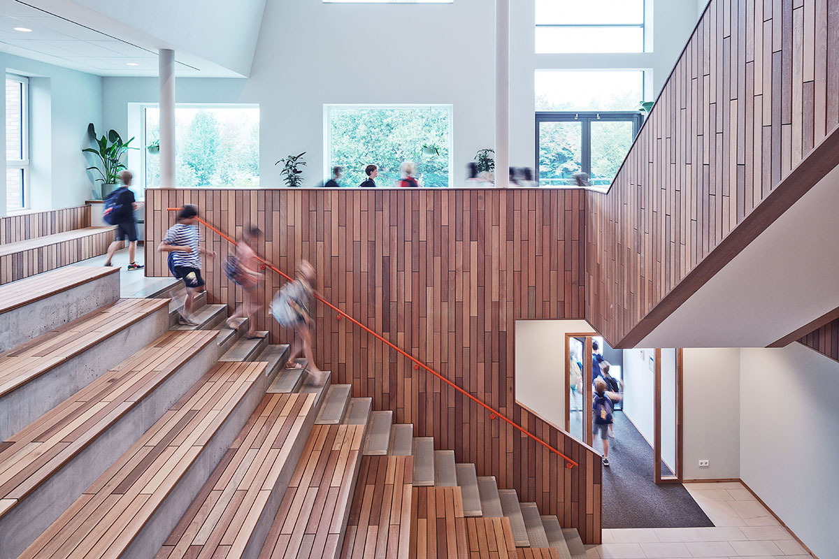 De school biedt ruimte aan 17 groepen en een breed onderwijsaanbod met extra aandacht voor kunst, cultuur en techniek. We wilden dat de school van elke m2 kan profiteren. Daarom ontwierpen we royale verkeersruimten die niet zomaar gangen zijn, maar plekken waar gespeeld, gewerkt en samengewerkt kan worden. De grote trap in de hal kan veranderen in een theatertribune: ideaal voor voorstellingen of buurtbijeenkomsten. De gymzaal – bij ons “beweegbox” voor meerdere groepen tegelijk – is los van de school toegankelijk en wordt ook gebruikt door clubs en verenigingen. En de pleinen zijn buiten schooltijd gewoon open voor de kinderen uit de buurt. Zo wordt de school een echt wijkhart.