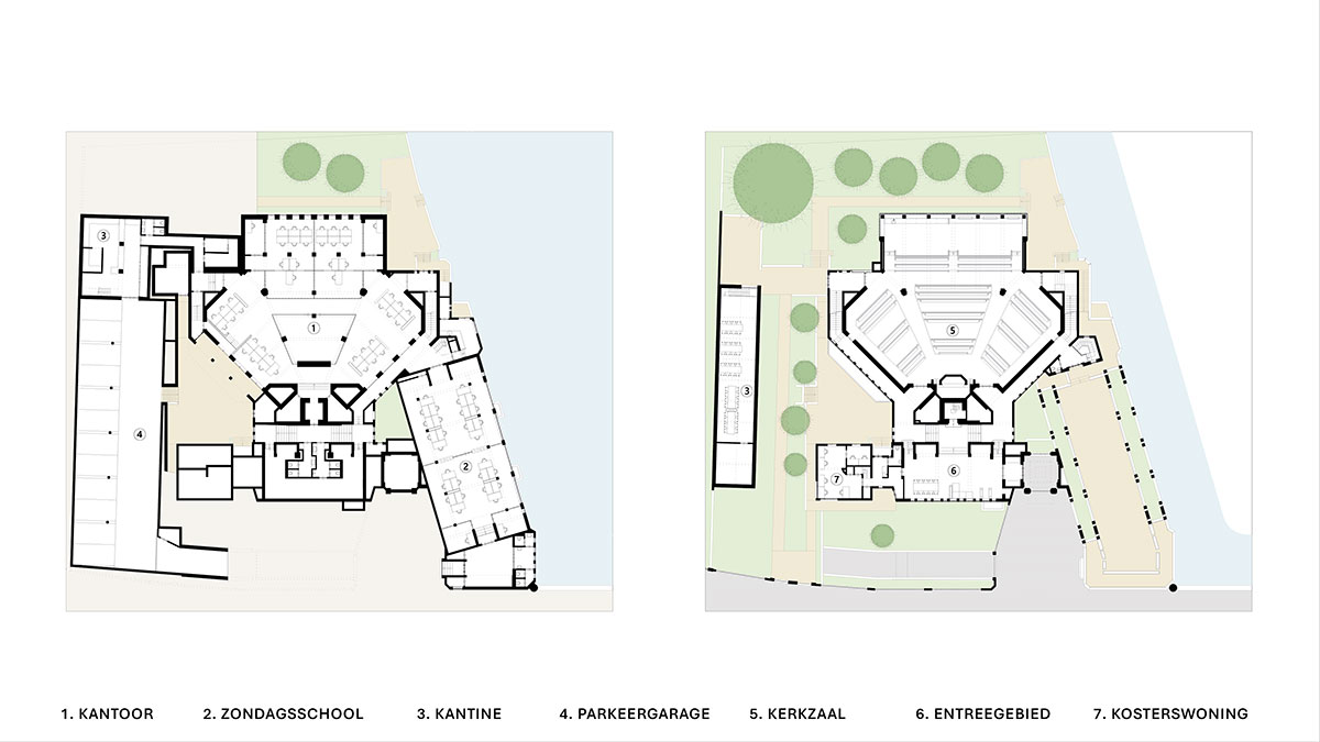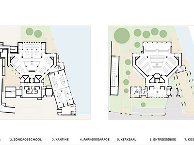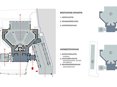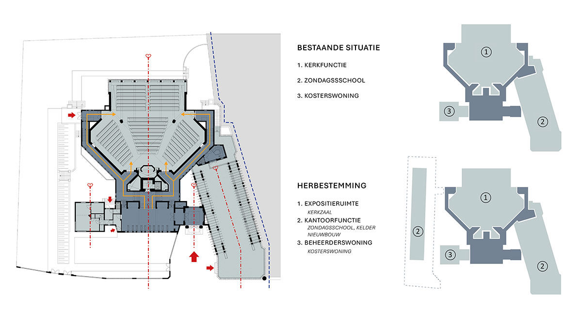 Het kerkgebouw zal na de herbestemming een kantoorfunctie krijgen, waarbij de opdrachtgever ook zijn kunstcollectie een markante plek in het gebouw wil geven. Aan de hand van het programma van eisen is een definitief ontwerp gemaakt, waarbij naast een programmatische invulling van het bestaande kerkgebouw ook nieuwbouw is gerealiseerd. De kerkzaal heeft in het ontwerp een flexibel gebruik gekregen. Door het behoud van een groot deel van de kerkbanken en de open opstelling hiervan ontstaan informele ontmoetingsplekken en de mogelijkheid voor het tentoonstellen van kunst. De kerkzaal kan bij gelegenheid goed ingezet worden voor een meer openbaar gebruik als bijvoorbeeld presentaties, lezingen, recepties, e.d. Naast het bestaande kerkgebouw is in de tuin op een zorgvuldige manier nieuwbouw toegevoegd. Op kelderniveau zijn hierin de benodigde parkeerplaatsen gerealiseerd. Dit nieuw toegevoegde volume is tevens gebruikt om een toevoeging van functionele ruimte te realiseren, waarmee het bestaande kerkgebouw in zijn beschikbare vierkante meters ontlast wordt voor het gewenste functionele programma. Het nieuw toegevoegde volume in de tuin, dat half uit het maaiveld steekt, is in samenwerking met Ben van Berkel als een passend en bescheiden onderdeel van de tuininrichting vormgegeven en wordt zo een onderdeel van het totale complex. Door de kelderruimte van de kerk meer openheid en daglicht te geven kan deze functioneel worden ingezet. Een goede verbinding met de ondergrondse nieuwbouw en de voormalige zondagsschool is hierdoor mogelijk. De omarmende ontsluitingsstructuur van de kerkzaal en het balkon die zich zo duidelijk aftekent in de externe gebouwvorm is in de kelder doorgezet. Hierdoor blijft er een logische structuur in het gebouw bestaan waarbij alle lagen vanuit de grote hal aan de voorzijde goed ontsloten kunnen worden.