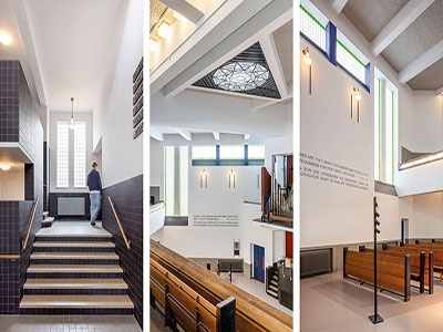 De First Church Of Christ Scientist is de enige kerk die H.P. Berlage ontworpen heeft en is in 1925 tot 1926 gebouwd. Het exterieur en het interieur (Piet Zwart) is ontworpen als Gesamtkunstwerk. Het samenspel maakt het gebouwencomplex, bestaande uit een kosterswoning, het kerkgebouw en de zondagsschool, tot een uniek rijksmonument. In de afgelopen decennia is door de kerkgemeenschap onderhoud gepleegd aan het gebouw, waarbij vooral de glazen bouwstenen in het gebouw een zorgenkind zijn geweest. Ook zijn veel daken voorzien van een zwevende dakconstructie om het betonskelet van het gebouw te beschermen. OPGAVE Kerkgebouwen, zeker van een bijzondere categorie als deze, zijn moeilijk her te bestemmen gebouwen. Het monolithische karakter, de structuur en de bescherming van interieuronderdelen als kerkbanken en orgel, samen met de grote emotionele lading van omgeving en parochianen, maken het proces van herbestemmen gecompliceerd. Door een goede analyse van het gebouw en zijn omgeving is in samenspraak met de opdrachtgever een plan ontstaan dat zich goed verhoudt tot de architectuur en structuur van het gebouw. Er is gefaseerd vergunning verleend voor het plan, via beginseluitspraak naar restauratieplan en vervolgens de herbestemmingsvergunning. Ook de uitvoering is om zorgvuldigheidsredenen gefaseerd uitgevoerd. Het is mede te danken aan de goede communicatie die we in dit proces in acht hebben genomen t.a.v. de vergunningsprocedure, de relatie met opdrachtgever en gebruikers, de omgeving rondom het gebouw in de Internationale zone van Den Haag en de uitvoerende partijen en specialisten, dat er een grote mate van zorgvuldigheid en betrokkenheid is ontstaan.