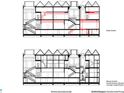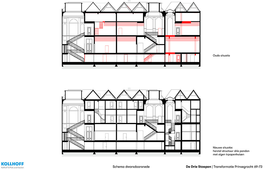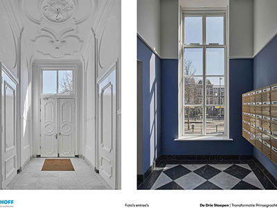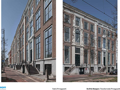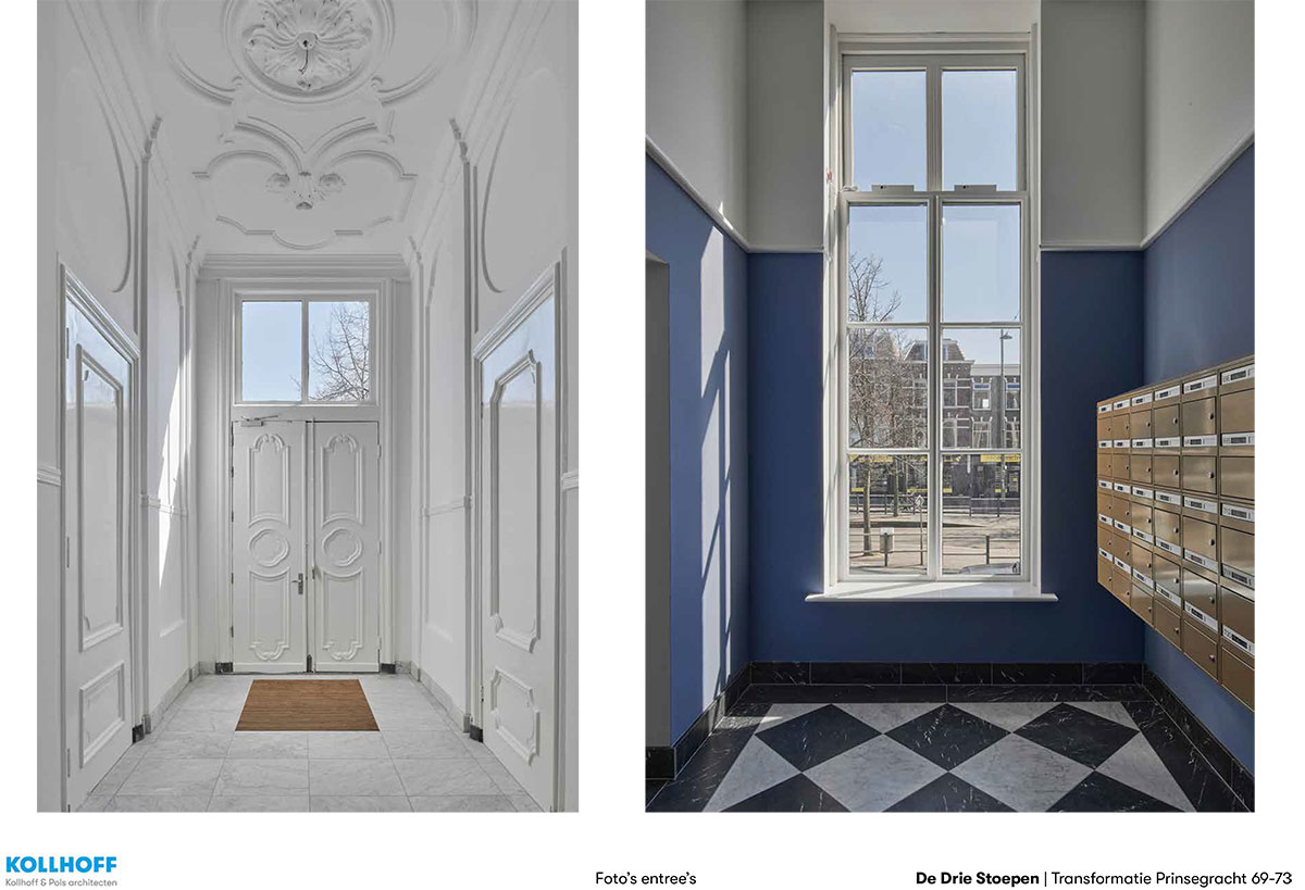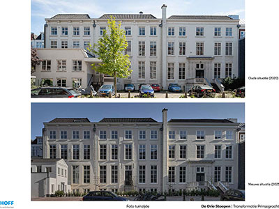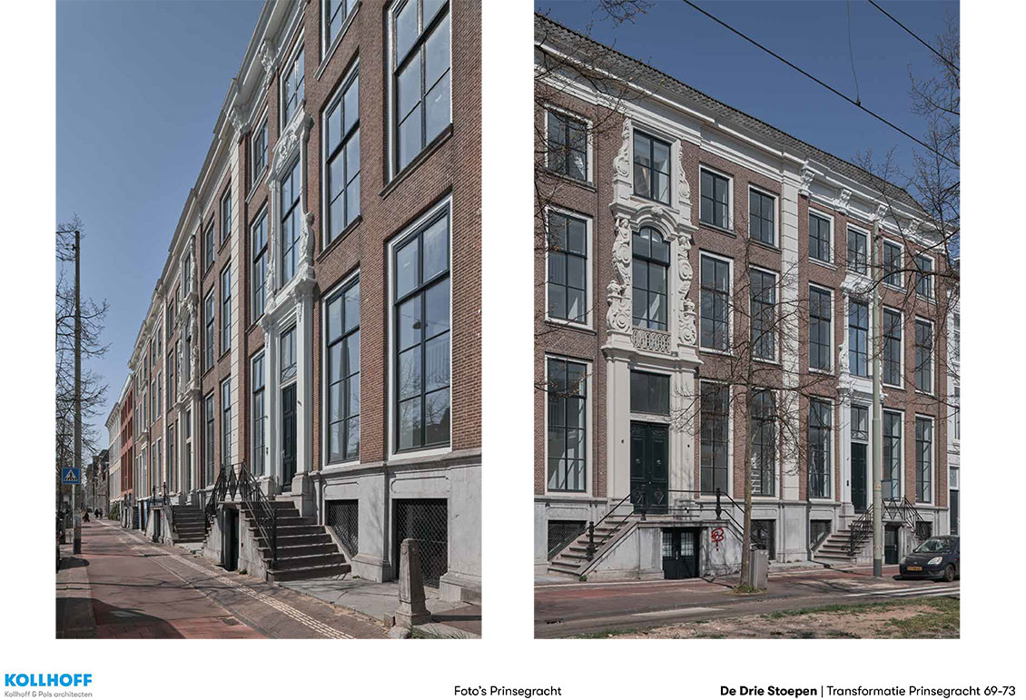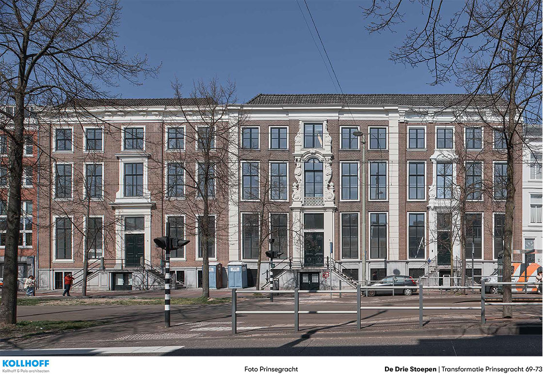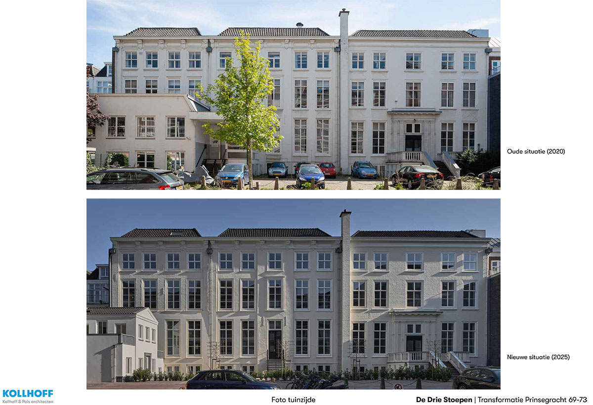 In drie leegstaande grachtenpanden in het centrum van Den Haag, gebouwd in Louis XIV-stijl tussen 1726 en 1730, zijn 58 woningen gerealiseerd met een totaal bruto vloeroppervlak van 4.700 m2. Aan de achterzijde werd ruimte gevraagd voor tuin, fietsenstalling en parkeerplaatsen voor deelauto’s. Aanpak De drie stadspaleizen waren dichtgeslibd met kamertjes en gangen, de achterzijde was verrommeld. De tot vijf meter hoge ruimtes waren verlaagd met entresols en systeemplafonds. De gekozen aanpak was ‘op te ruimen’ en de structuur van de drie panden binnen weer afleesbaar te maken. De drie entree’s zijn in ere hersteld en hebben weer doorgangen naar de tuin gekregen. Van de helft van het parkeerterrein aan de achterzijde is een gezamenlijke tuin gemaakt. De aanbouw is vervangen door een kleiner ‘tuinhuis’ dat herinnert aan de verdwenen diepe tuinen met koets- en tuinhuizen.