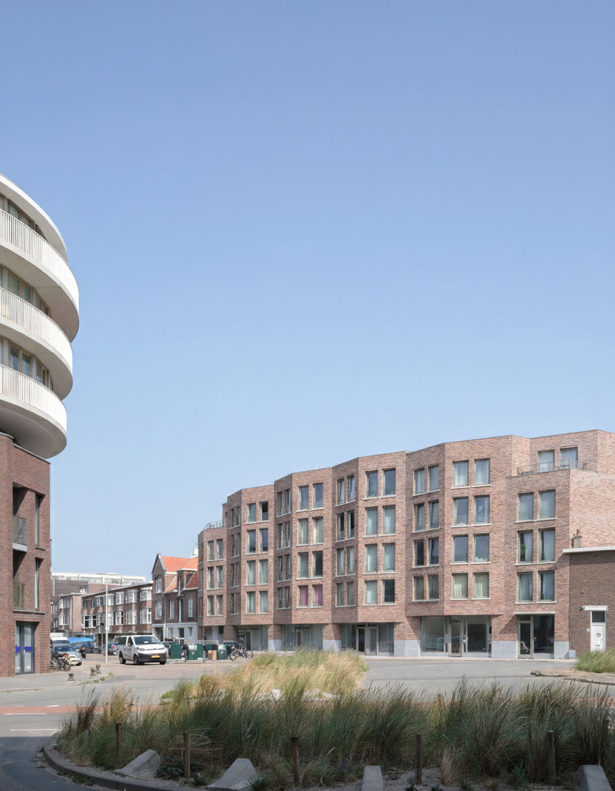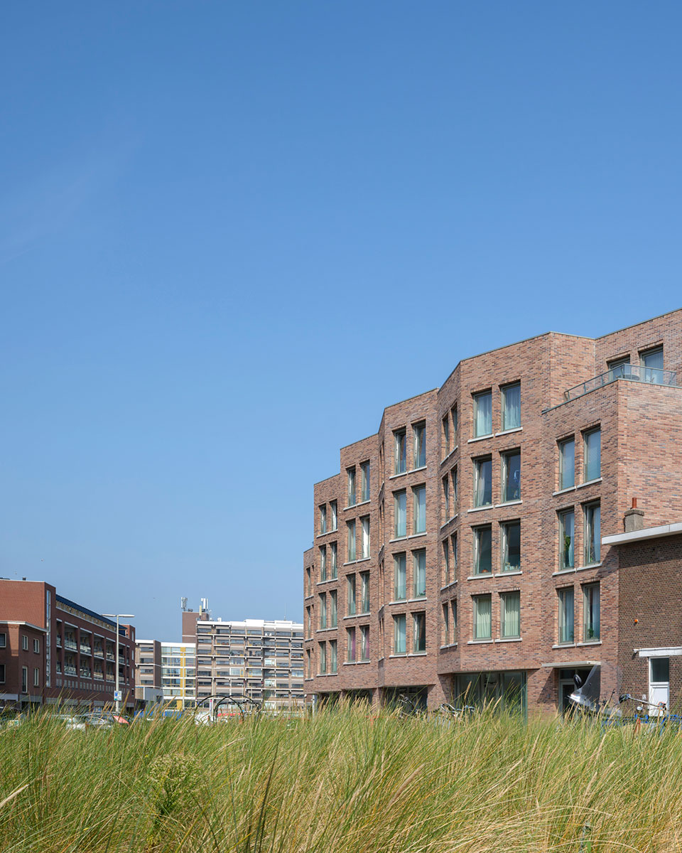 Aan de Korbootstraat is de massa eveneens getrapt opgebouwd om de aansluiting op de naastgelegen panden te vinden. De diepe neggen en drielaagse erker brengen plastiek in de gevel die zich verder bescheiden opstelt in de straatwand. Het gebouw heeft twee gezichten maar ook verwantschap. Ze horen duidelijk bij elkaar. Samen kijken ze uit op een gezamenlijke binnentuin.