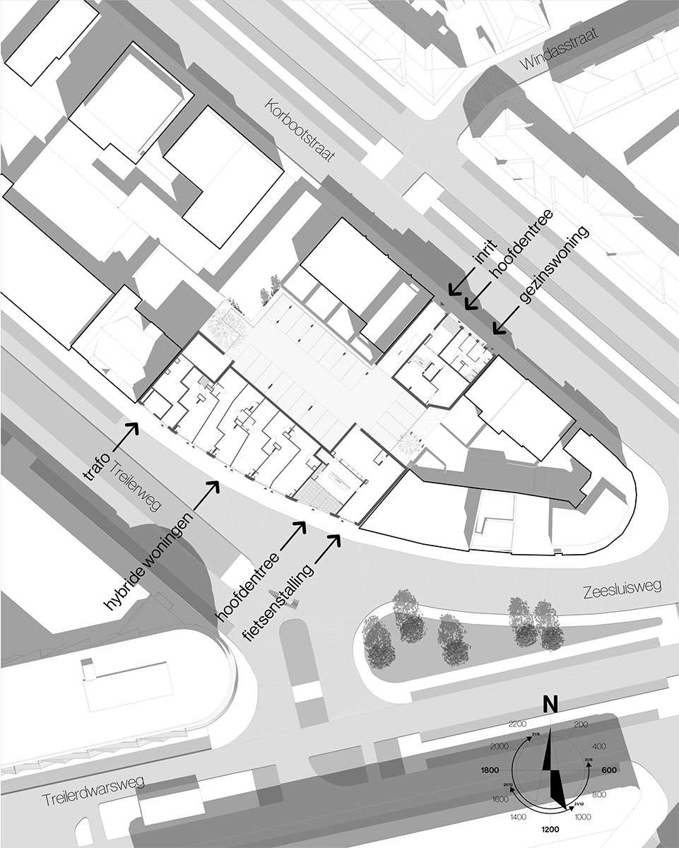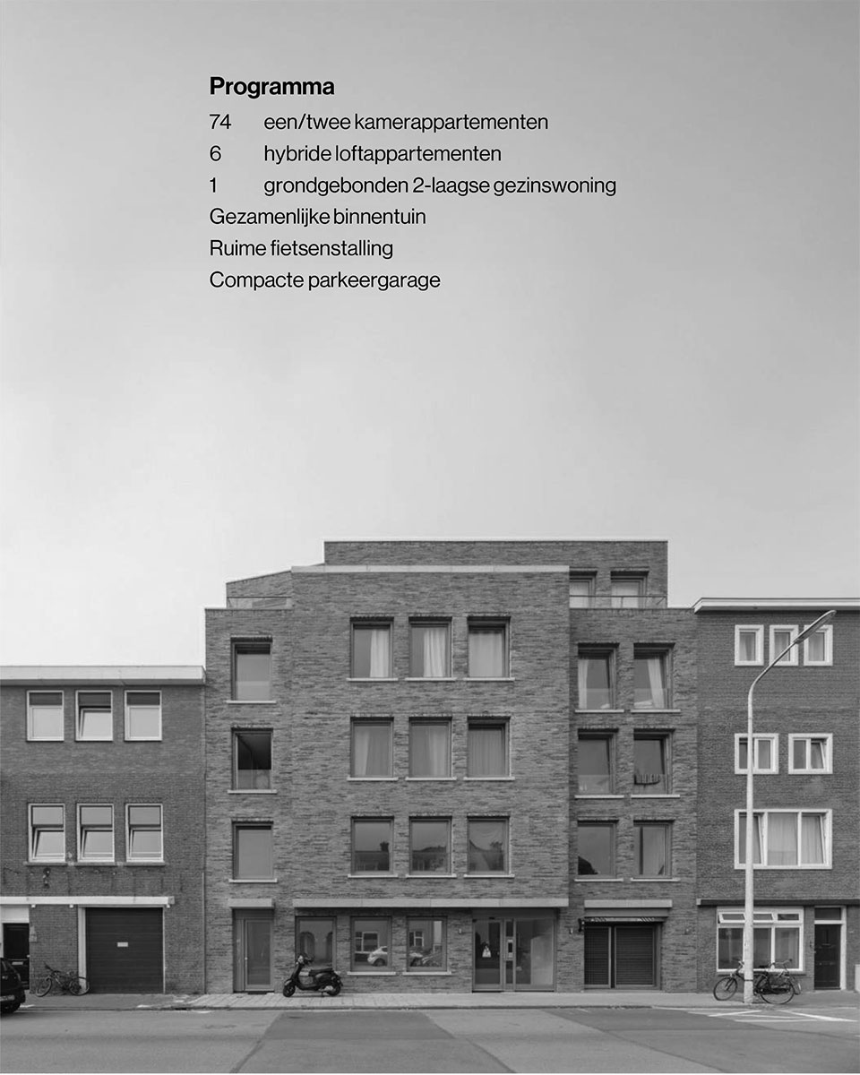 Programma: 74 1/2-kamerappartementen, 6 hybride loftappartementen in de plint, 1 grondgebonden gezinswoning, parkeergarage, fietsenstalling, gezamenlijke binnentuin.