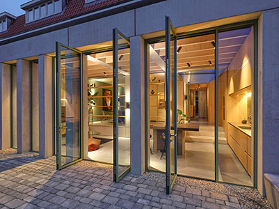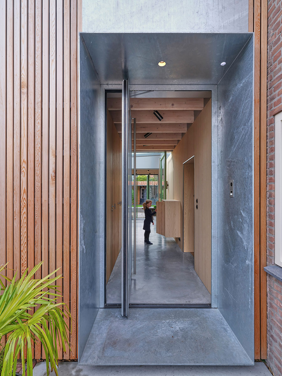 De entree van de woning bestaat uit een verzinkte stalen nis die door de houten gevel van de uitbouw steekt. In de nis zit een stalen taatsdeur die dezelfde breedte en hoogte als de hal heeft. Deze deur is ook vervaardigd uit het rauwe verzinkte staal. Eenmaal door de poort kom je binnen in een nieuwe ruime hal. Deze hal wordt gedefinieerd door aan een zijde de oude bestaande wand van het huis. De bestaande wanden van het huis die om het trappenhuis liggen, zijn zo bewerkt dat ze nu als een houten volume in de ruimte staan. Aan de andere zijde van de hal begeleidt een nieuwe houten wand de gebruiker vanaf de entree tot aan de achterzijde van het huis. In deze houten wand zitten alle ondersteunende functies waaronder toilet, garderobe, techniek, opslag en keuken. Vanuit de hal komt je terecht in het nieuwe hart van het huis. Onder het grote dakraam in de uitbouw van het huis, heeft zich het nieuwe hart van het huis gevormd. Hier is het licht, er is groen en de grote prefab betonnen traptreden bieden een plek om te zitten. De afwezigheid van een duidelijke functie voor deze ruimte, maakt de ruimte juist zo krachtig. Het zorgt daardoor voor een verstilling in de ruimte en dat is een verrijking voor het huis.