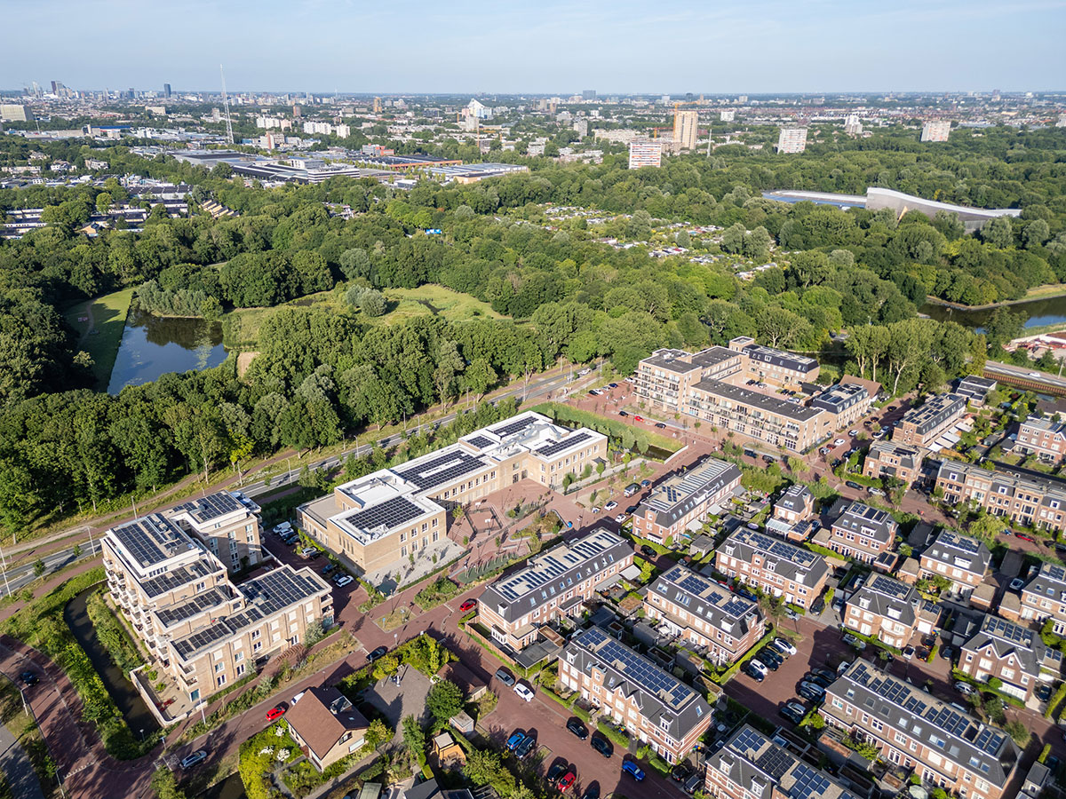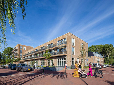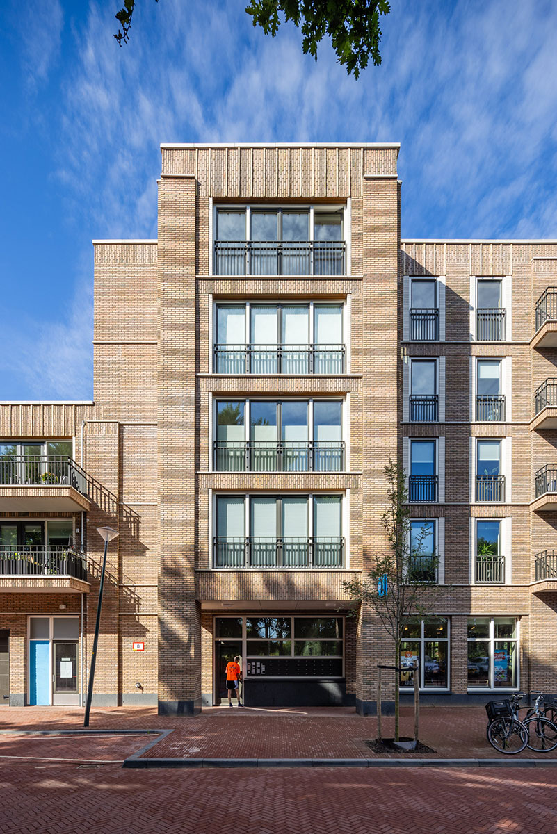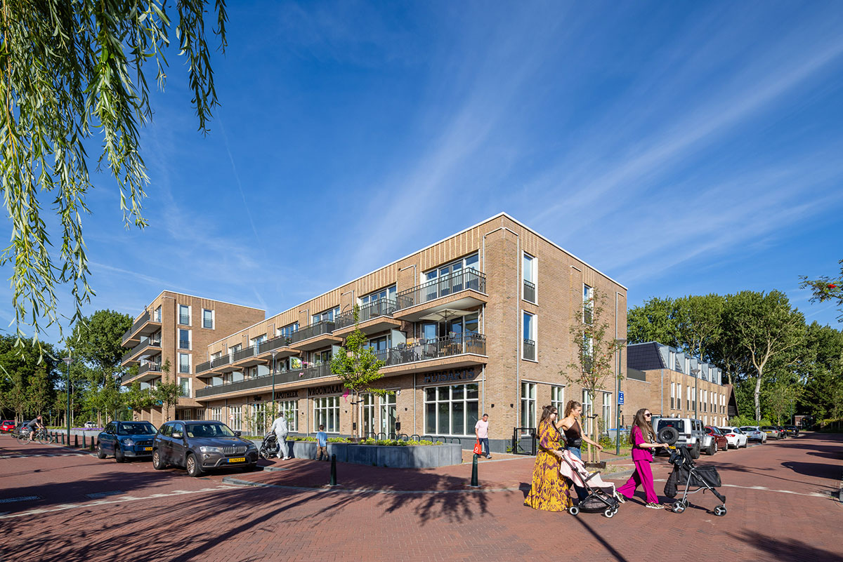 Programma: 12 eengezinswoningen en een complex met 35 appartementen met voorzieningen in de plint: een buurtsuper (AH), een bakkerij en een huisartsenpraktijk met apotheek. De bewoners parkeren afgeschermd op het binnenhof.
